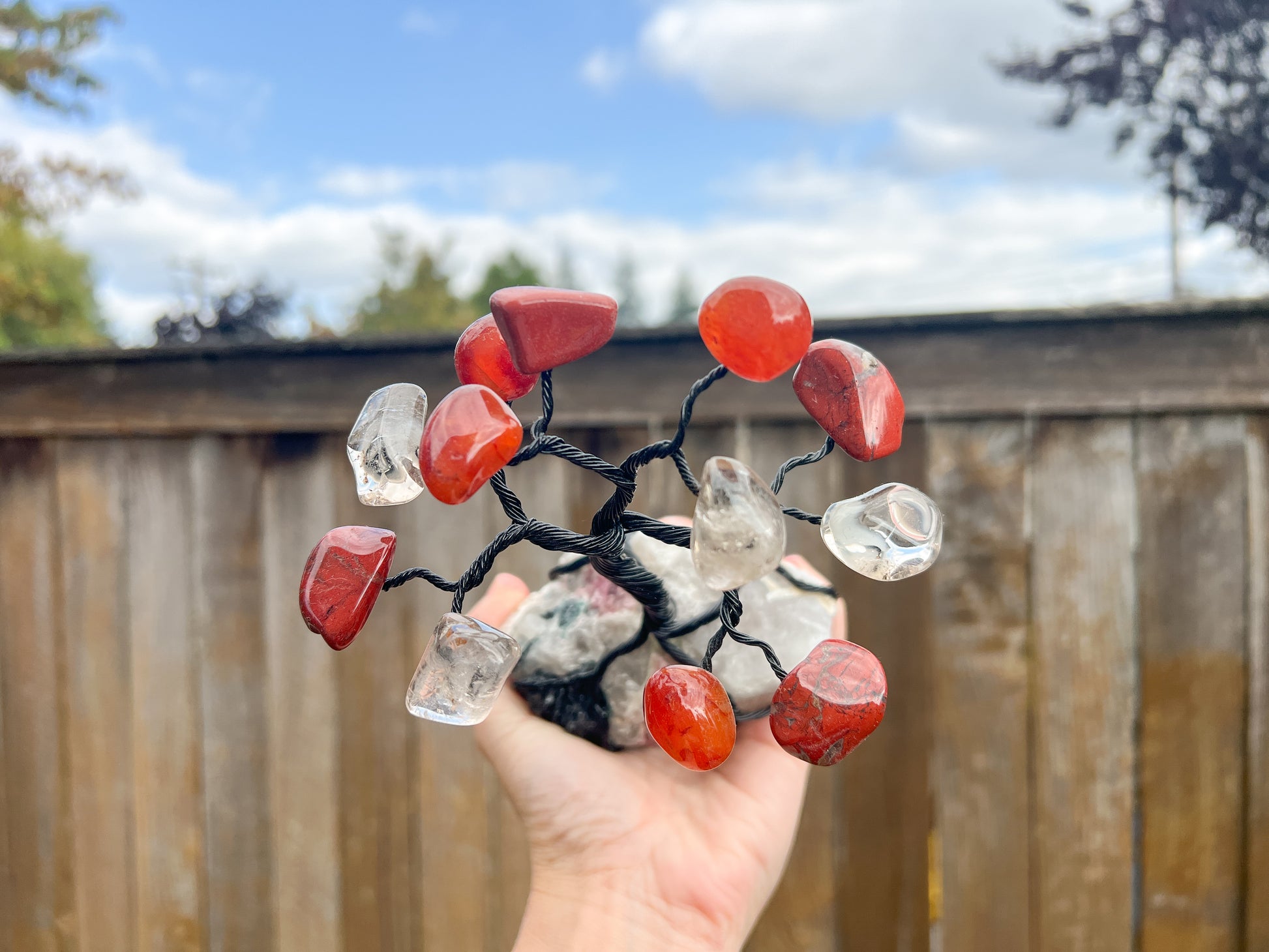 Handmade crystal tree with 12 crystal leaves including citrine, carnelian, and red jasper—stones chosen to enhance Aries’ courage, energy, and determination:
