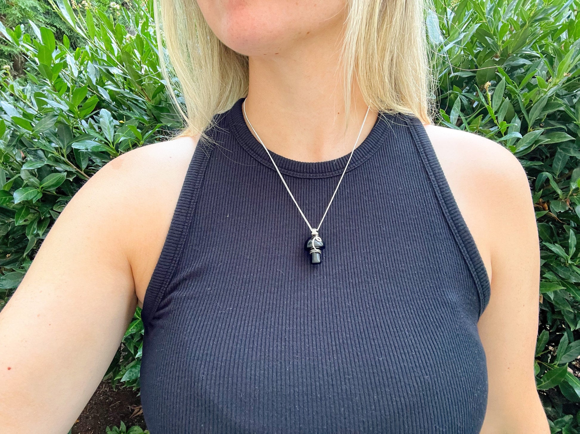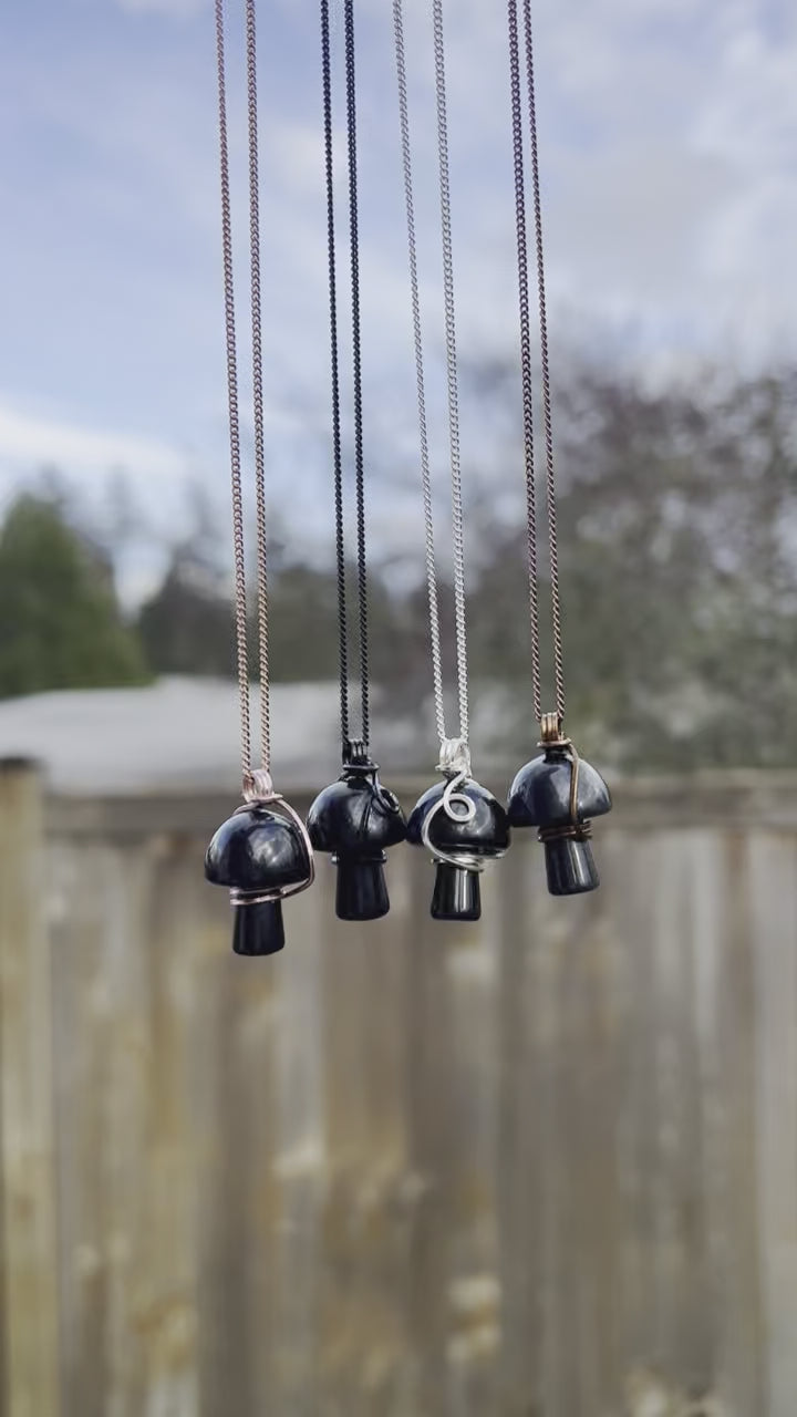 Black Obsidian mushroom crystal necklace with a simple wire wrap. This necklace is perfect to add to your daily jewelry collection or as a gift to a crystal lover!