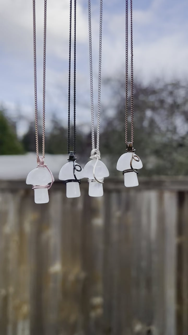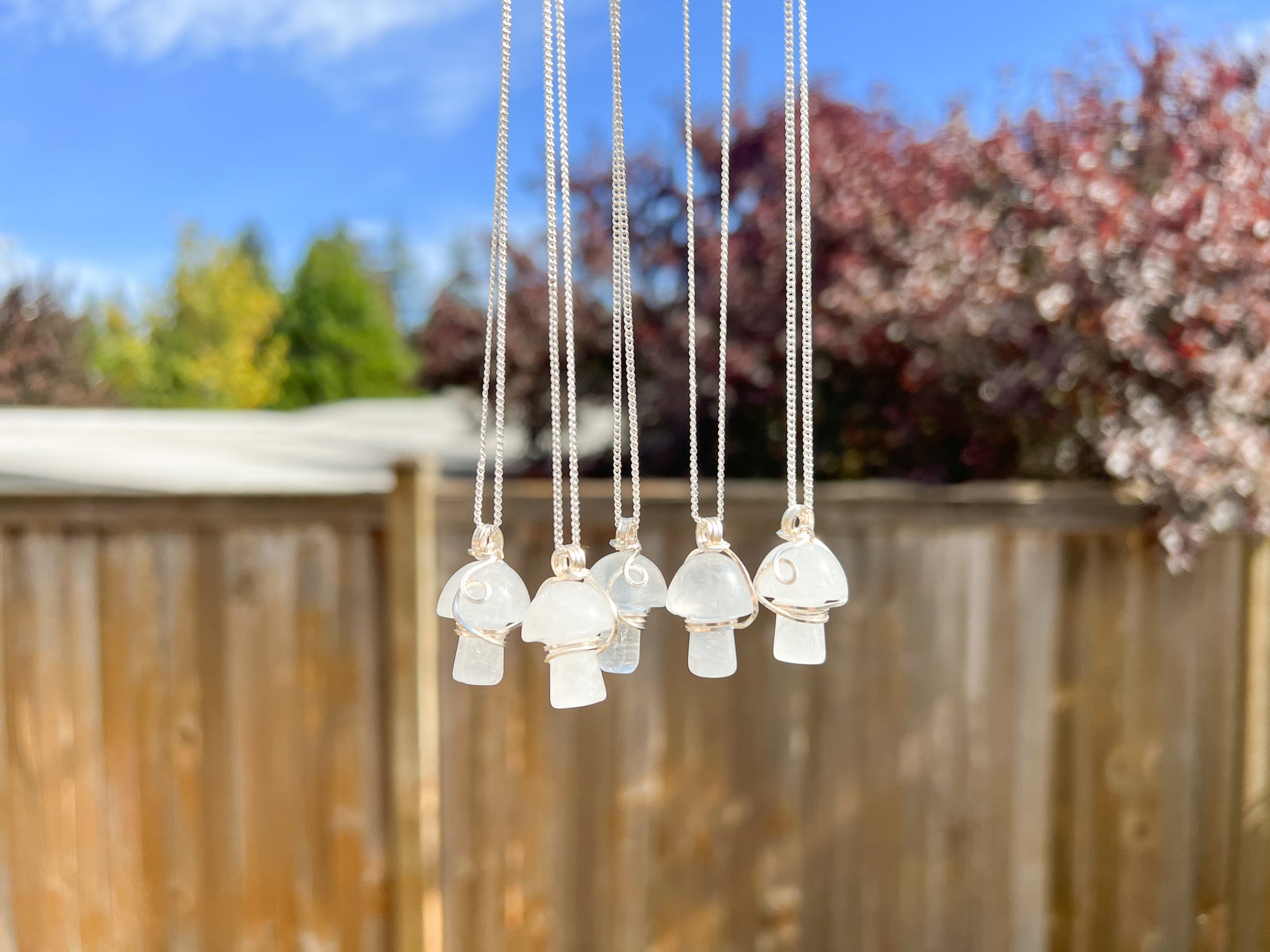 Clear Quartz mushroom crystal necklace with a simple wire wrap. This necklace is perfect to add to your daily jewelry collection or as a gift to a crystal lover!