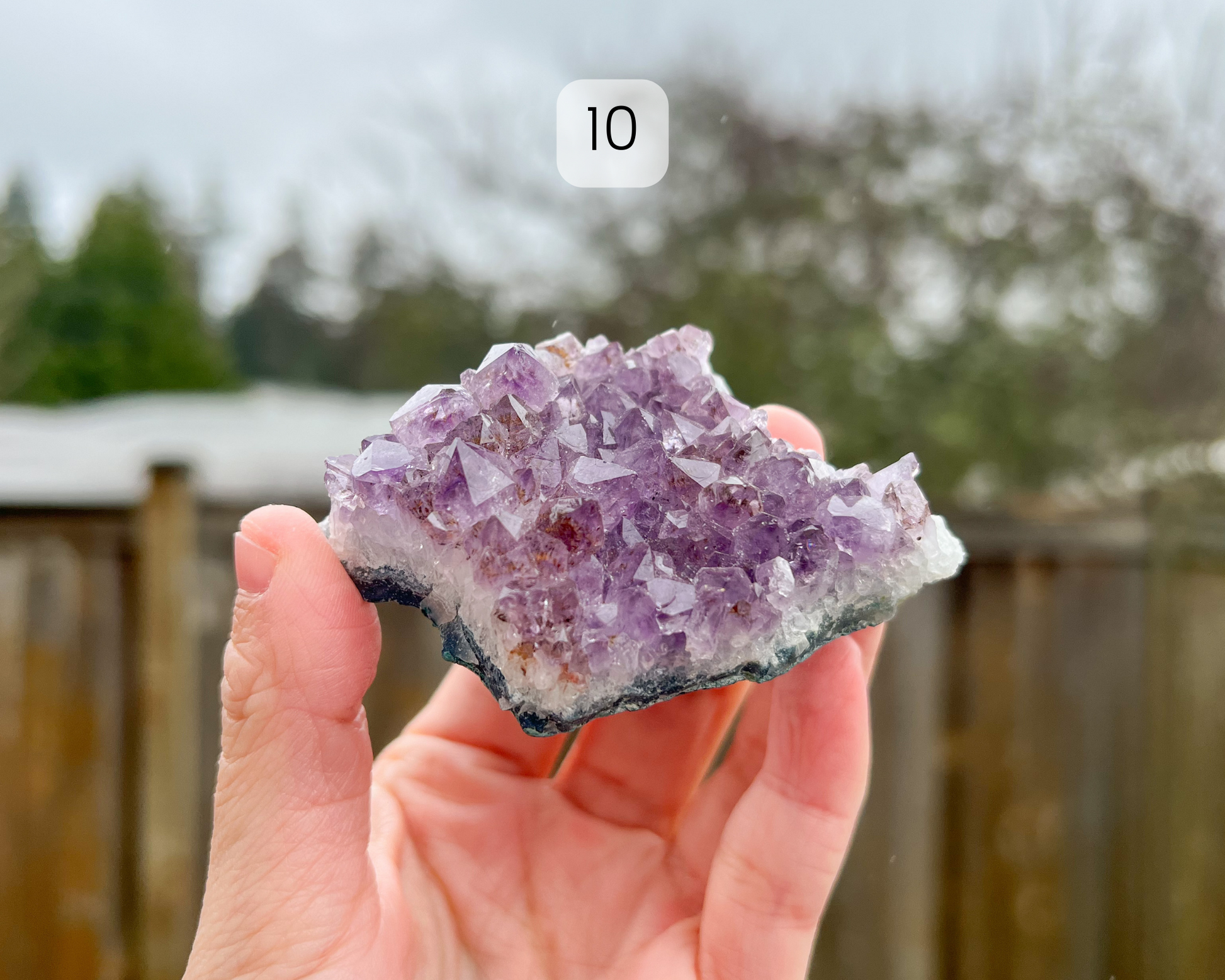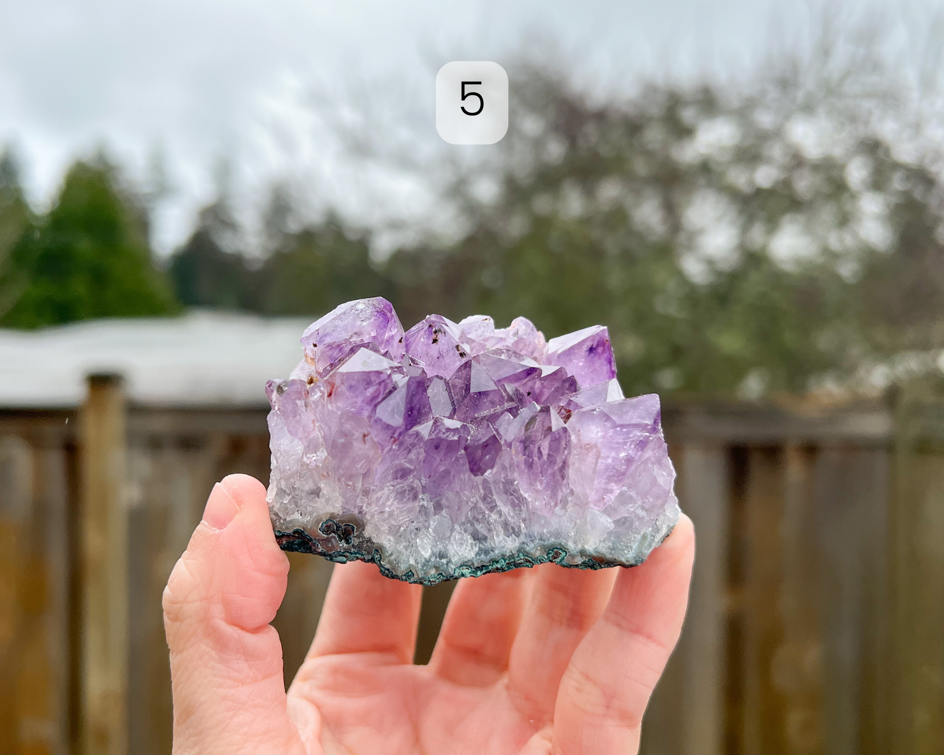 There are various small to medium sized amethyst cluster crystal bases. The base selected determines the size of crystal tree. A small size is generally 5-6 inches in height and medium is generally 6-7 inches in height. You can select the specific amethyst crystal base.