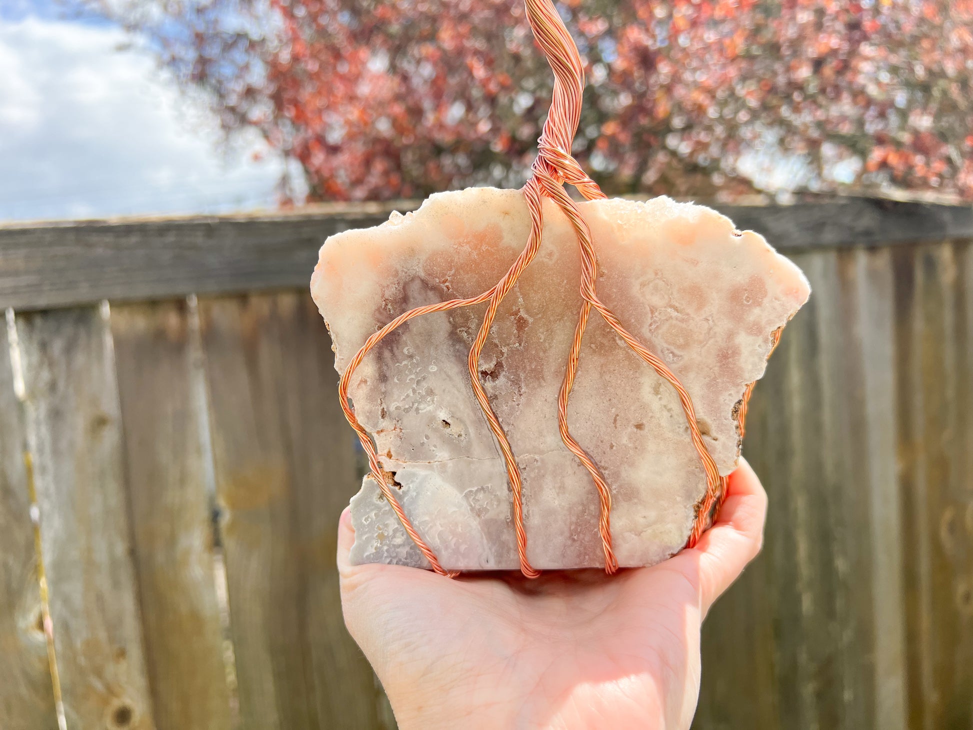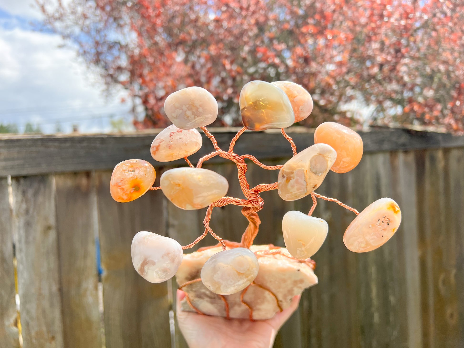 This one-of-a-kind Flower Agate and Pink Amethyst Crystal Tree is handmade with tarnish resistant copper wire, attached to a Pink Amethyst front polished slab from Argentina. A grade tumbled Flower Agate stones from Madagascar are attached to the wire as the crystal leaves. Bring nature's beauty into your home with this unique piece!