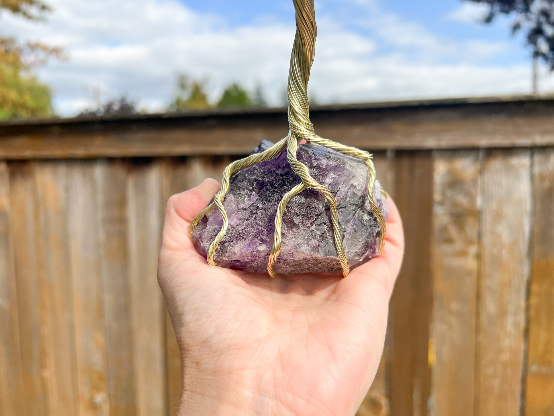Rooted in a purple fluorite base, a stone that enhances mental focus, clarity, and insight while supporting Gemini’s love of learning and versatility, and finished with gold wire to honor the air element, this piece embodies balance and insight. A meaningful gift or display for anyone born under Gemini or drawn to its versatile, communicative energy.
