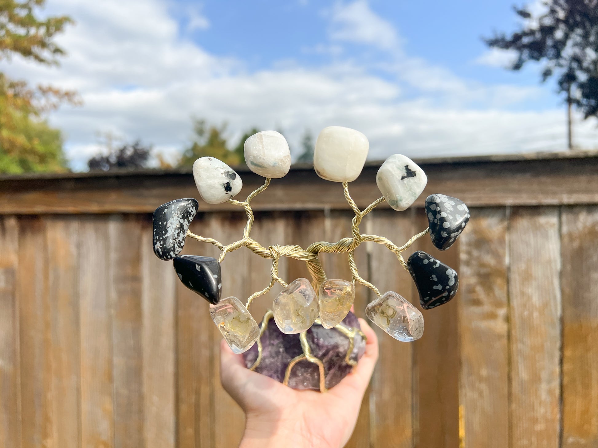 Handmade crystal tree with 12 crystal leaves including natural citrine, rainbow moonstone, and snowflake obsidian—stones chosen to support Gemini’s curiosity, adaptability, and mental clarity: