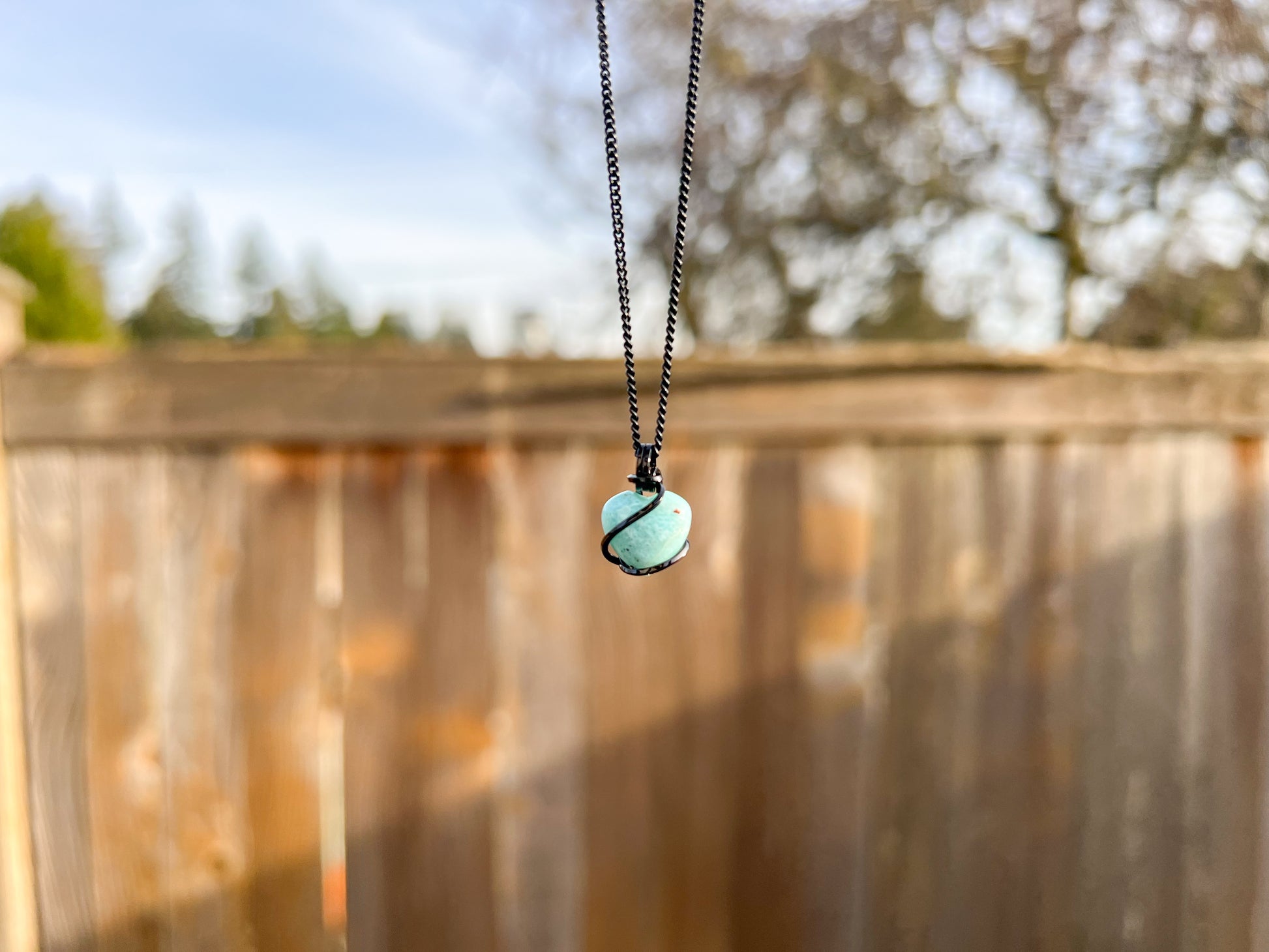 Larimar heart crystal necklace with a simple wire wrap. This necklace is perfect to add to your daily jewelry collection or as a gift to a crystal lover!