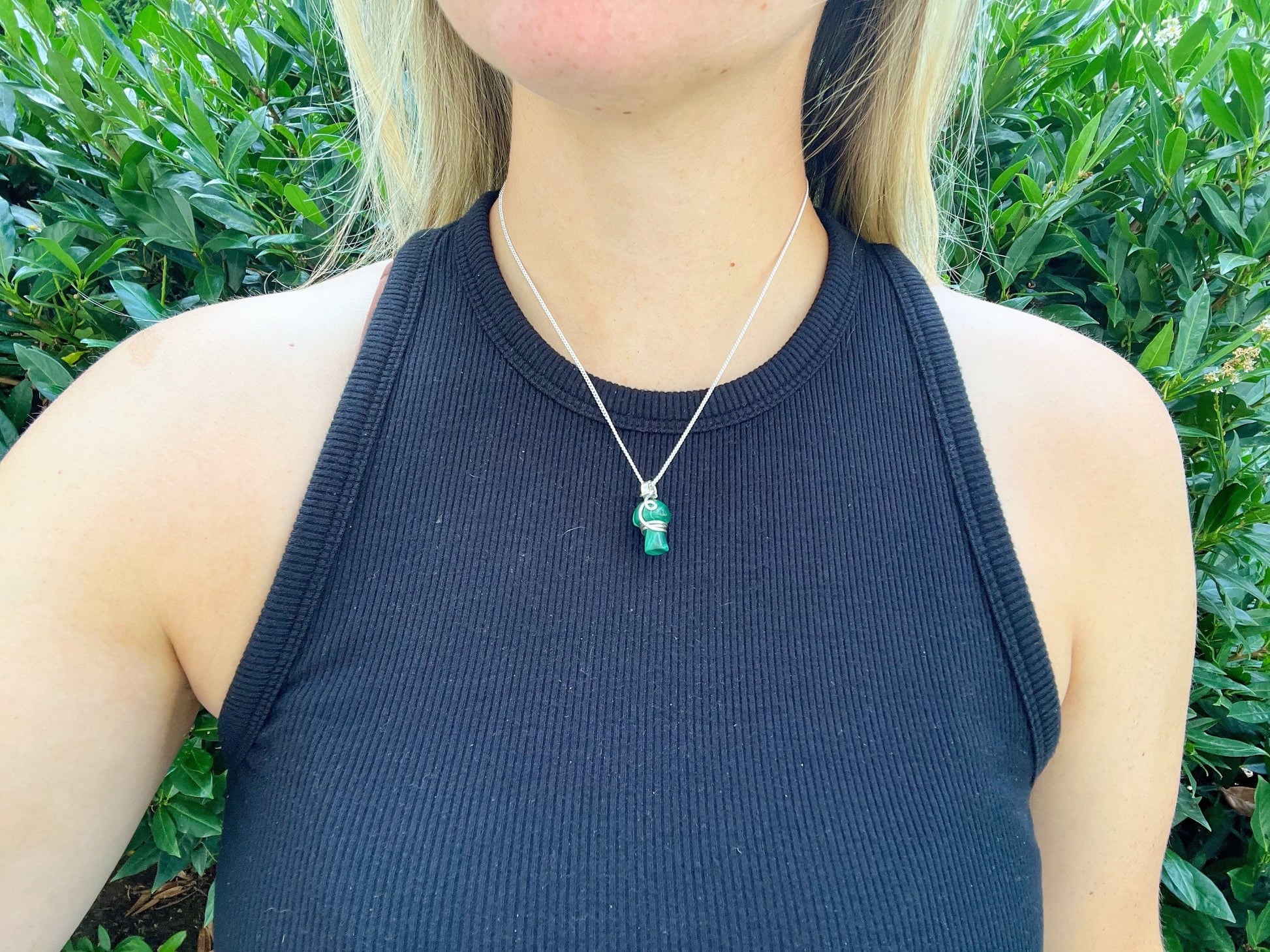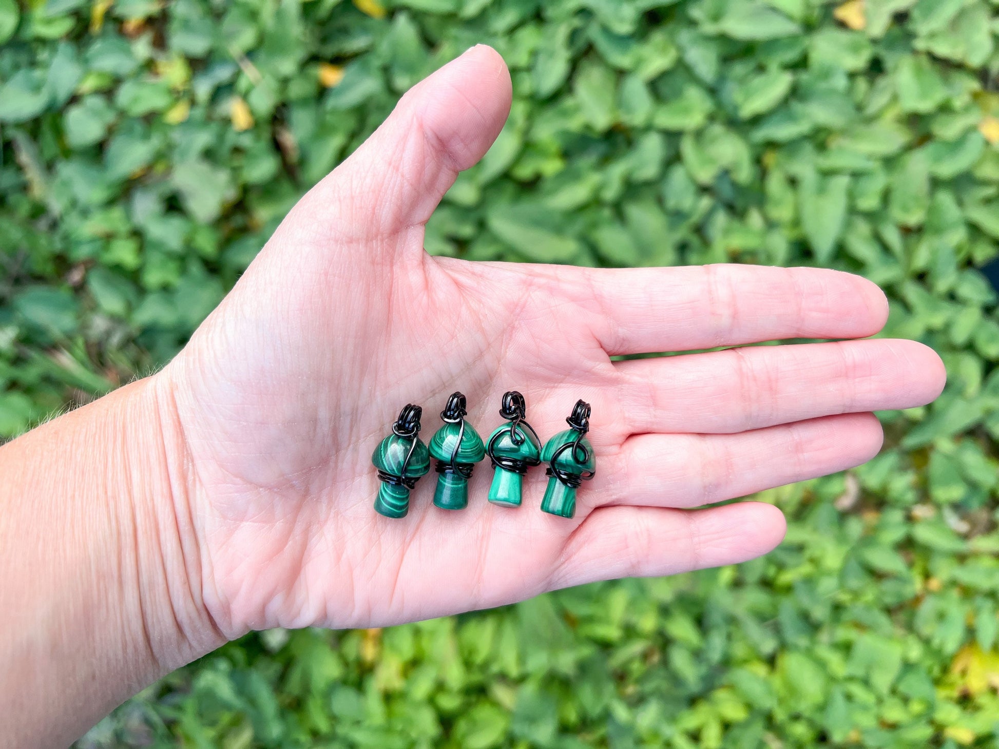 Malachite mushroom crystal necklace with a simple wire wrap. This necklace is perfect to add to your daily jewelry collection or as a gift to a crystal lover!
