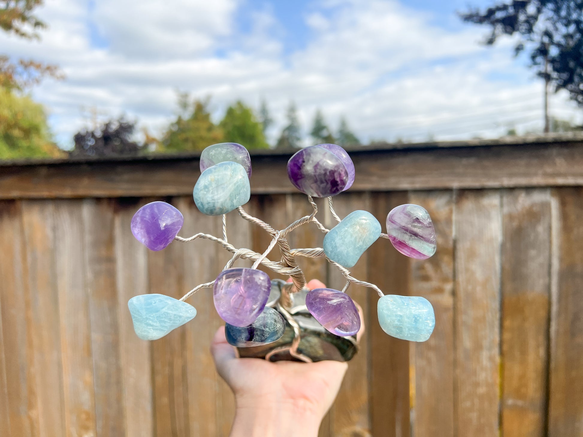 Handmade crystal tree with 12 crystal leaves including fluorite, amethyst, and aquamarine—stones chosen to support Pisces’ intuition, empathy, and creativity: