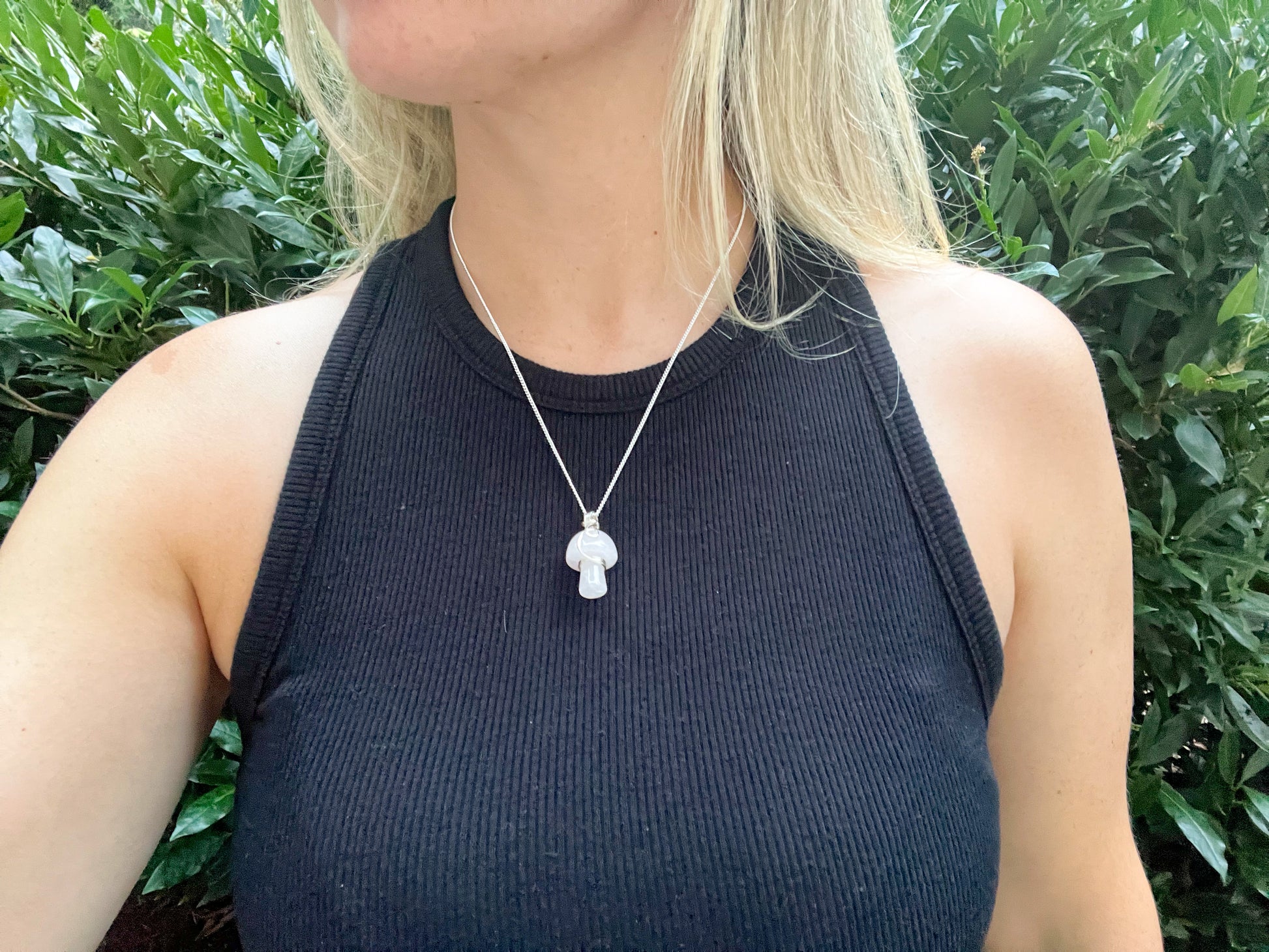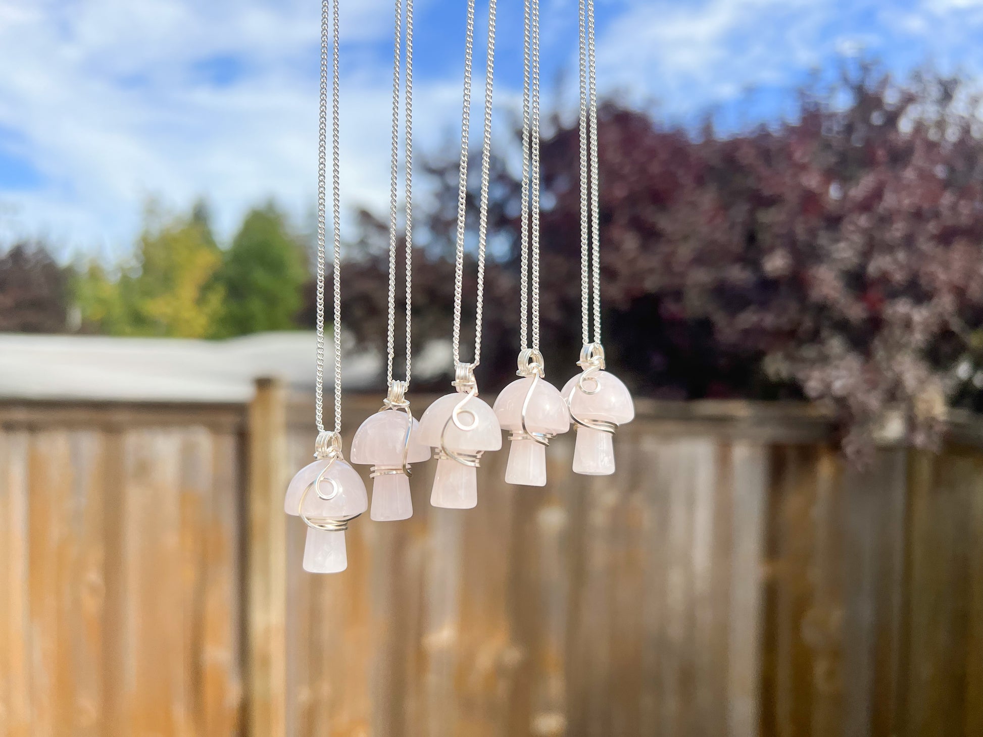 Rose Quartz mushroom crystal necklace with a simple wire wrap. This necklace is perfect to add to your daily jewelry collection or as a gift to a crystal lover!