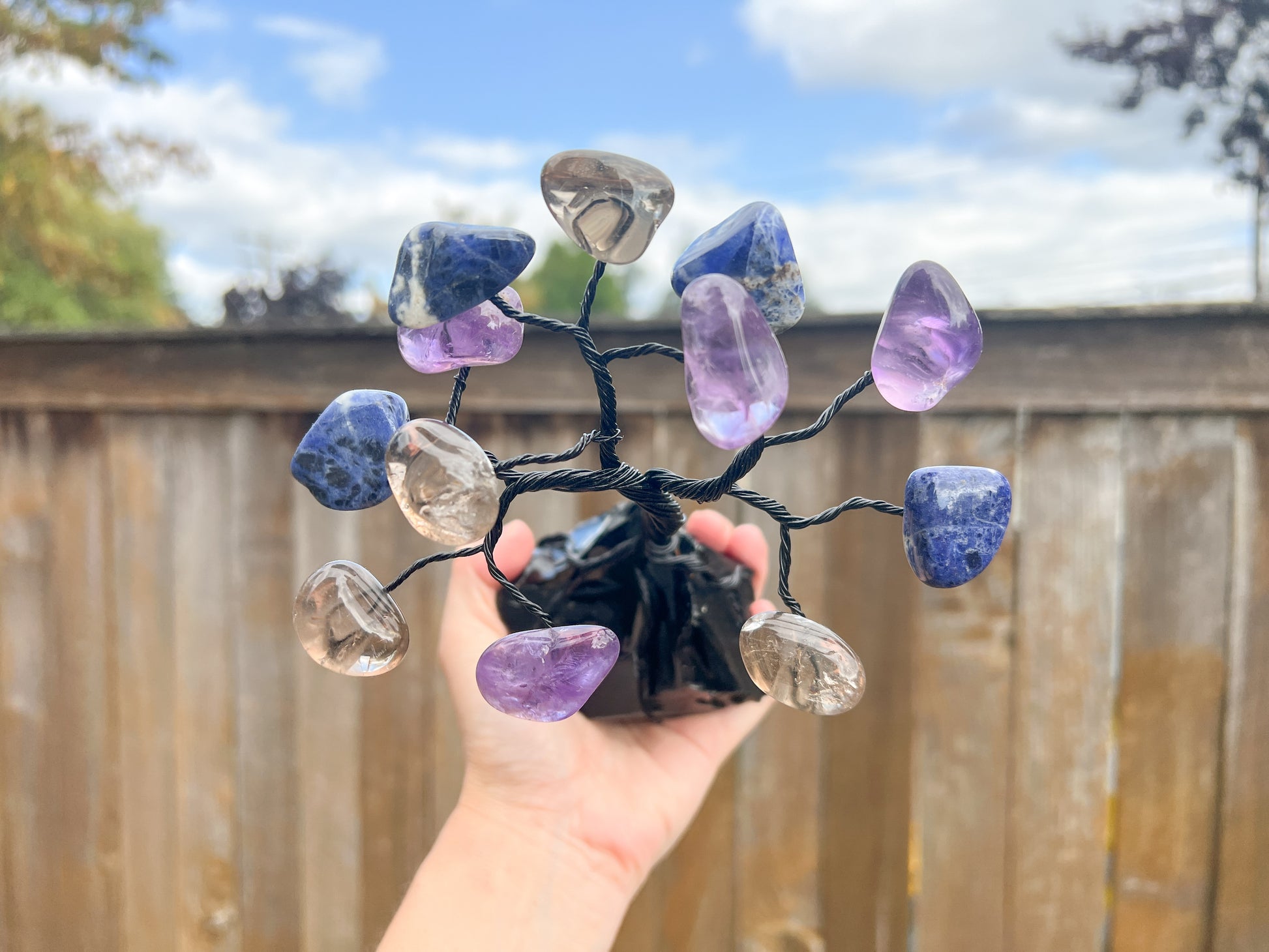 Handmade crystal tree with 12 crystal leaves including amethyst, smoky quartz, and sodalite—stones chosen to support Sagittarius’ optimism, adventure, and wisdom: