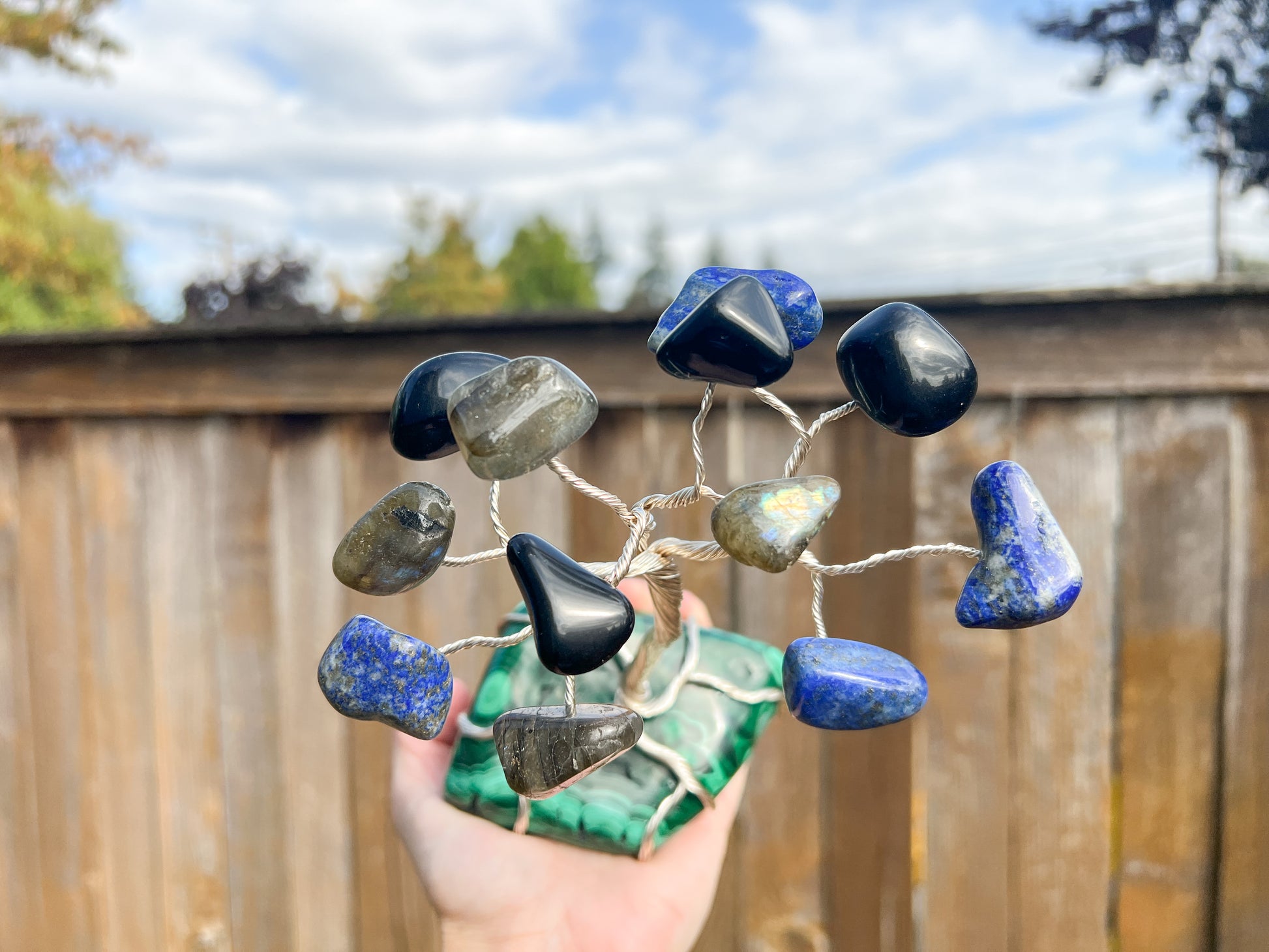 Handmade crystal tree with 12 crystal leaves including black obsidian, labradorite, and lapis lazuli—stones chosen to support Scorpio’s intensity, transformation, and intuition: