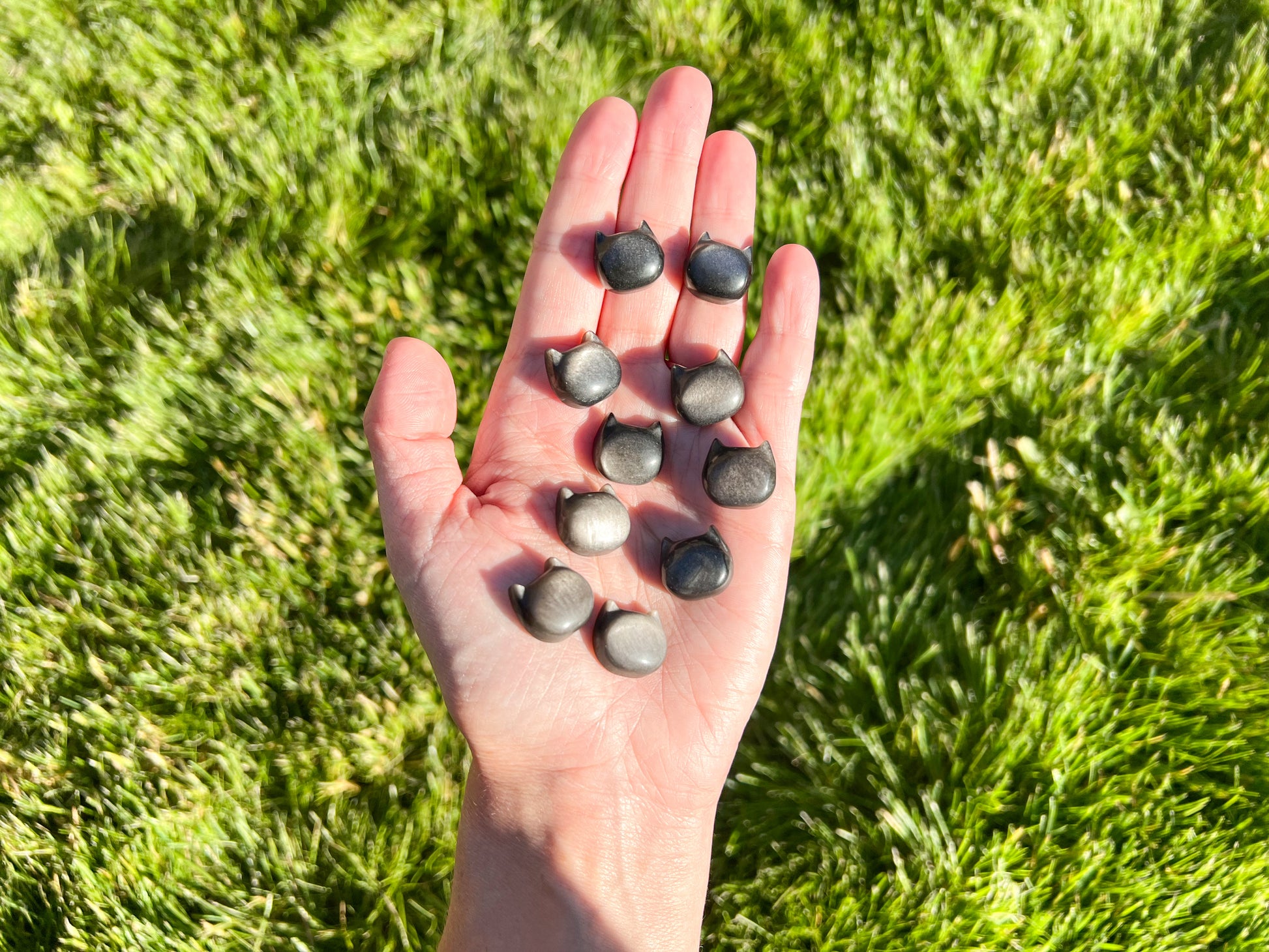 These adorable Silver Sheen Obsidian cat head carvings have a gorgeous sheen and may vary slightly in flashes. The back side of the carving is flat. You will receive a mystery carving.