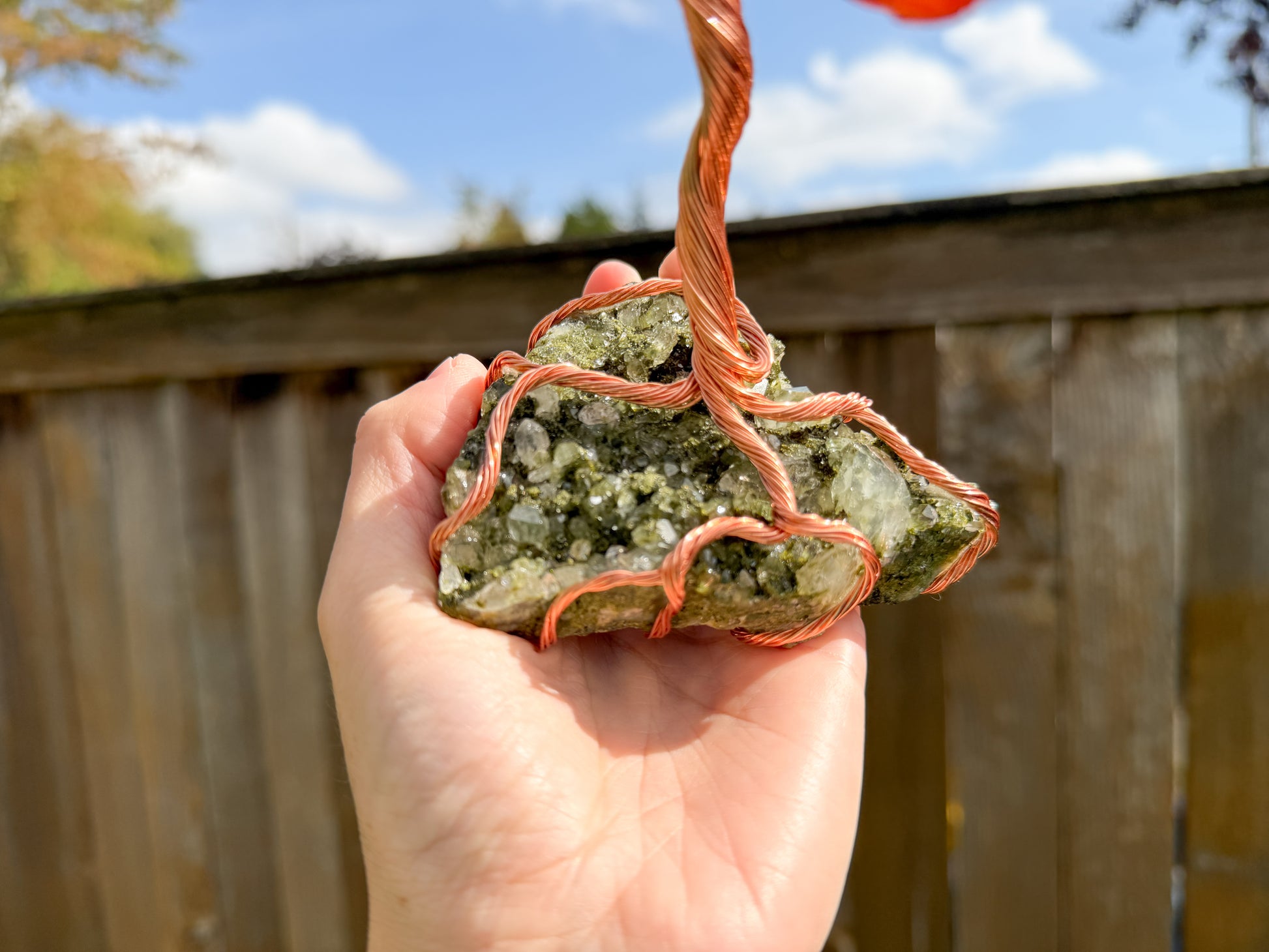 This crystal tree is handmade with tarnish resistant copper wire wrapped around an epidote crystal base. The wires are formed into a tree shape and the carnelian tumbled stones are attached.