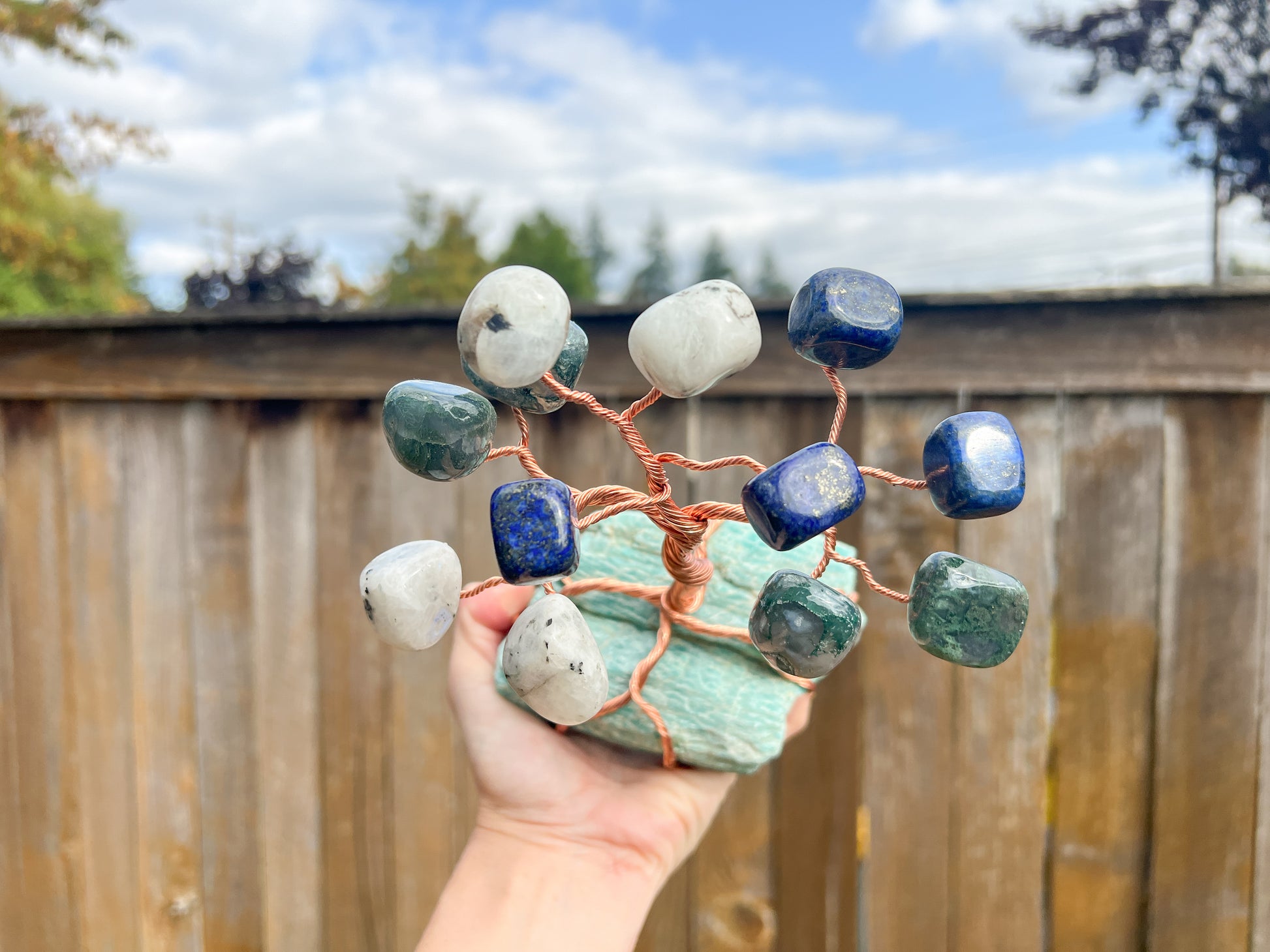 Handmade crystal tree with 12 crystal leaves including moss agate, lapis lazuli, and rainbow moonstone—stones chosen to support Virgo’s practicality, wisdom, and emotional balance: