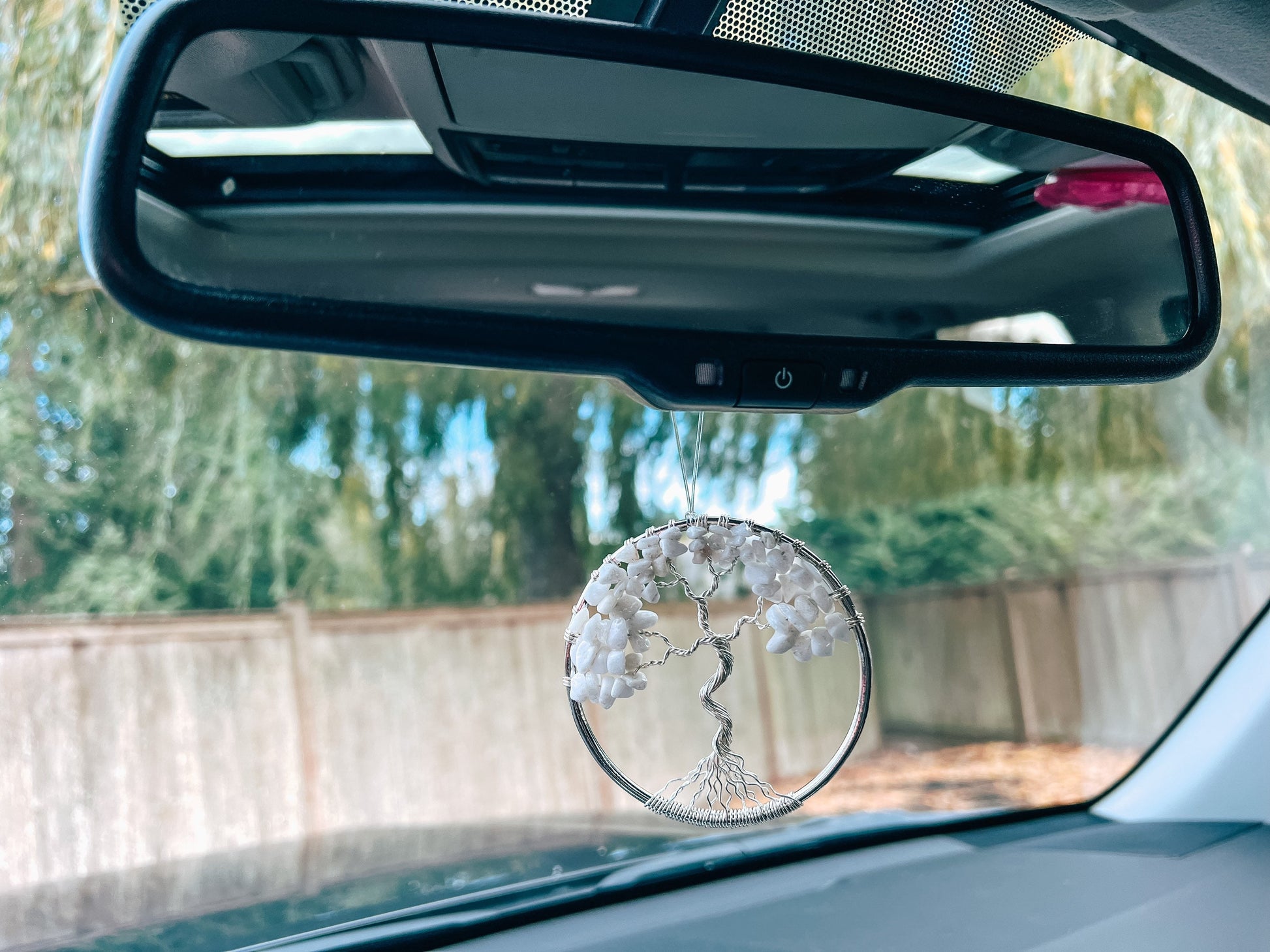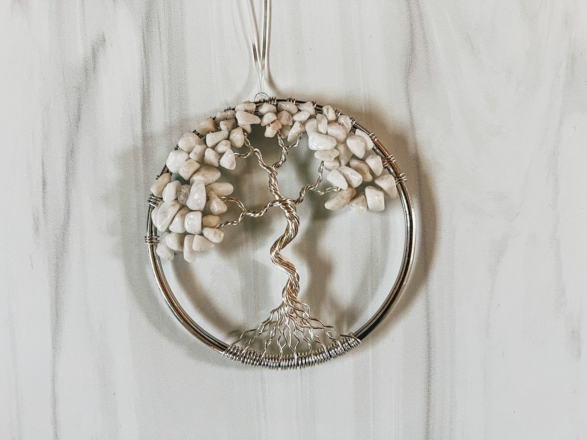 White Quartz Tree of Life ornament that is great for many occasions! Can be used as a car rear view mirror charm, Christmas tree ornament, or as a window or wall hanging.